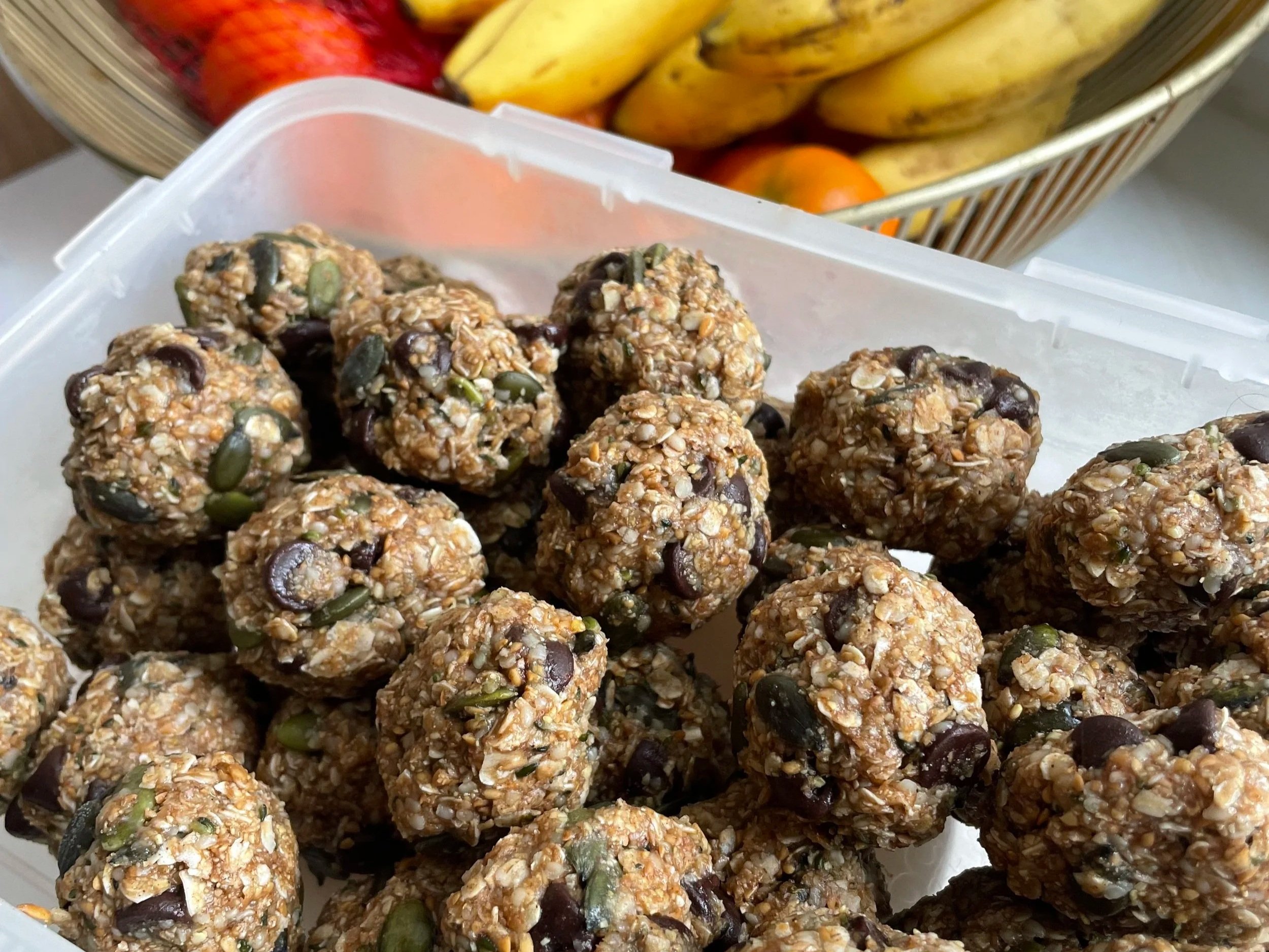 Here’s a quick, no bake recipe for a tasty, nutritious snack. They are just sweet enough to satisfy a cookie craving and just high enough in protein and fibre to double as a powerful snack. I try to always keep a batch in my freezer for a quick energy boost in the afternoon or post workout snack.